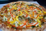 Creamy garlic sauce, red onion, artichoke hearts, mushrooms, fresh tomatoes, and mozzarella cheese.